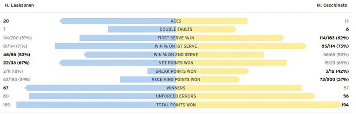 Sembra che finalmente l’inerzia della partita sia cambiata, infatti Cecchinato sale 3-1 anche nel quinto. I giocatori sono affaticati, e il palermitano a volte è costretto in difesa alzando le traiettorie per tirare il fiato. Laaksonen è però tornato ad anticipare molto bene i colpi, e con lo smash si porta 3 a 3. Da qui, nessun attacco ai servizi fino al tie-break decisivo. Fino ad adesso Marco ha avuto anche abbastanza sfortuna e il trend non cambia, anche perché lo svizzero ha più energie. Marco perde subito campo, con lo svizzero a colpire dritto su dritto. Finisce con Laaksonen a rete per il 7 a 2 con il punteggio finale di 7-6(3) 7-6(6) 2-6 3-6 7-6(2) in 3 ore e 52 minuti.