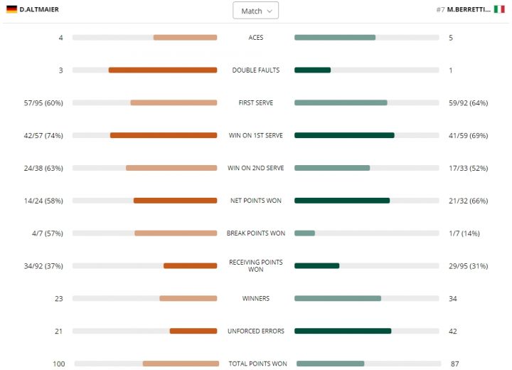 Altmaier ha giocato in maniera aggressiva, cercando di far leva sul rovescio di Berrettini e trovando il modo di non dare punti di riferimento a Berrettini nella risposta. Solo un break concesso dal tedesco in tutto il match, contro i quattro ottenuti. Matteo ha sfruttato solamente una palla break su sette, molto più per meriti del suo avversario che non per demeriti propri, ma una delle caratteristiche principali di Berrettini è sempre stata quella di rimanere aggrappato al match e cogliere le occasioni propizie, mentre oggi non è riuscito a girare il match, né nel secondo set quando pur giocando male è arrivato a servire sul 5-4 e al rush finale del tie-break, né nell’ultimo game quando il suo avversario ha sbagliato un paio di colpi di nervosismo e gli ha dato la chance di rispondere a qualche seconda.