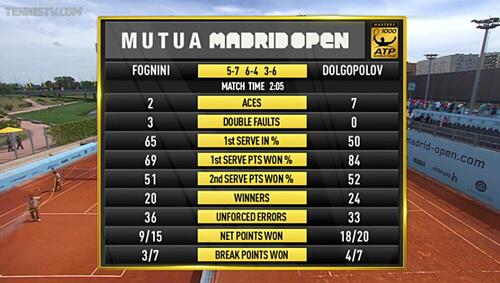 I due continuano a giocare uno splendido tennis, ma Fabio non riesce più a costruirsi opportunità sul servizio di Dolgopolov che chiude tenendo il servizio zero al primo match point con la solita accelerazione di rovescio. Nel finale Fognini persevera e dice a Lahyani: “Voglio parlarti ora. Non avere paura“.