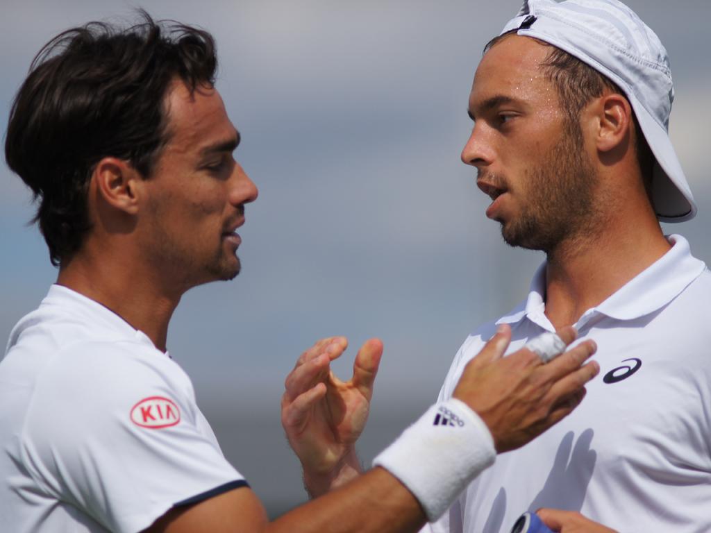La stretta di mano tra Fognini e Puetz (foto FABRIZIO MACCANI)