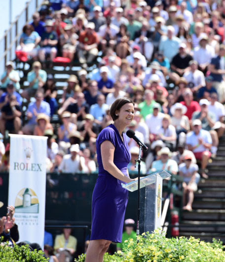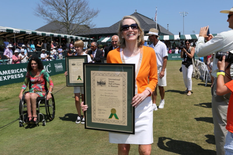 L’evento è stato condotto dal presidente dell’associazione, Christopher Clouser, e si è aperto con la presentazione di Chris Evert per Jane Brown Grimes, diventata presidentessa della USTA nel 2007 e che dal 1991 al 2001 è stata amministratore delegato della stessa Hall of Fame, facendosi carico della ristrutturazione degli edifici storici: “Posso dire in prima persona che la diplomazia di Jane è stata cruciale per la sopravvivenza del WTA Tour, dato che è stata abile nel navigare le difficoltose acque dell’attrarre e mantenere sponsorizzazioni desiderabili, mentre metteva le distanze tra la nostra associazione e marchi controversi. E’ stato un momento cruciale per il tennis femminile e ci ha messe sulla giusta strada per il futuro”. Brown Grimes ha a sua volta parlato dei cambiamenti che ha potuto osservare nello sport e del ruolo del tennis nelle relazioni internazionali, ricordando come Martina Navratilova ricevette un caldo benvenuto quando giocò in Fed Cup a Praga, poco dopo esser diventata cittadina americana: “Ci sono così tanti esempi in questo sport che lasciano spazio alla tolleranza e alla comprensione, in un mondo spesso lacerato da aspri conflitti. Così il tennis è diventato più grande, più forte e più ricco, ma ha anche fatto quello che Dwight Davis si era posto come obiettivo fondando la Coppa Davis nel 1900, per promuovere la buona volontà internazionale… Mi sento così fortunata ad aver ricoperto un seppur piccolo ruolo in questa storia meravigliosa e nell’essere premiata in questo modo, oggi, su questo campo e di fronte a così tanti amici, alla mia famiglia e ai fan, che sono molti di più di quanto avessi mai immaginato”.