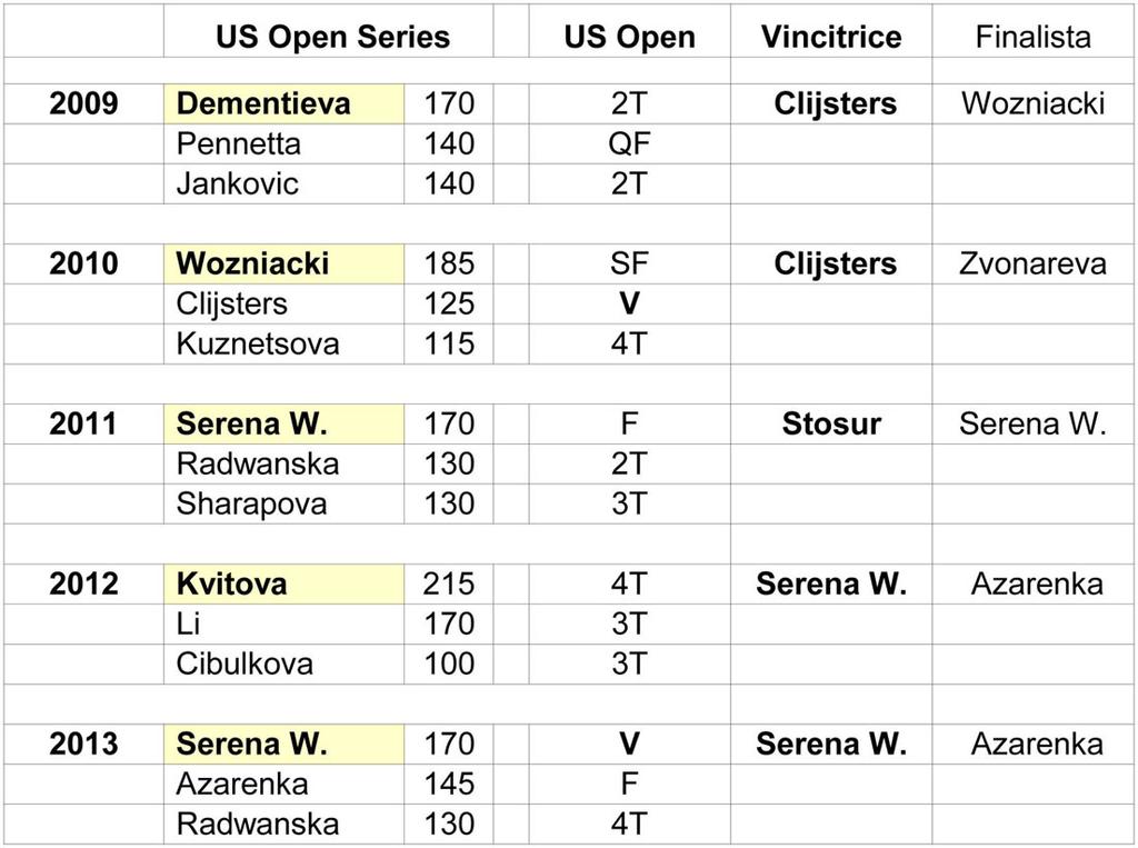 Per quanto riguarda le US Open Series, invece, i dati ci dicono che questi tornei non hanno lo stesso valore predittivo: negli ultimi cinque anni, solo nel 2013 chi ha vinto la classifica dei tornei di agosto si è confermata a New York (Serena Williams), mentre negli anni precedenti il nome che compare in cima alle Series non si ritrova nell’albo d’oro di Flushing Meadows: