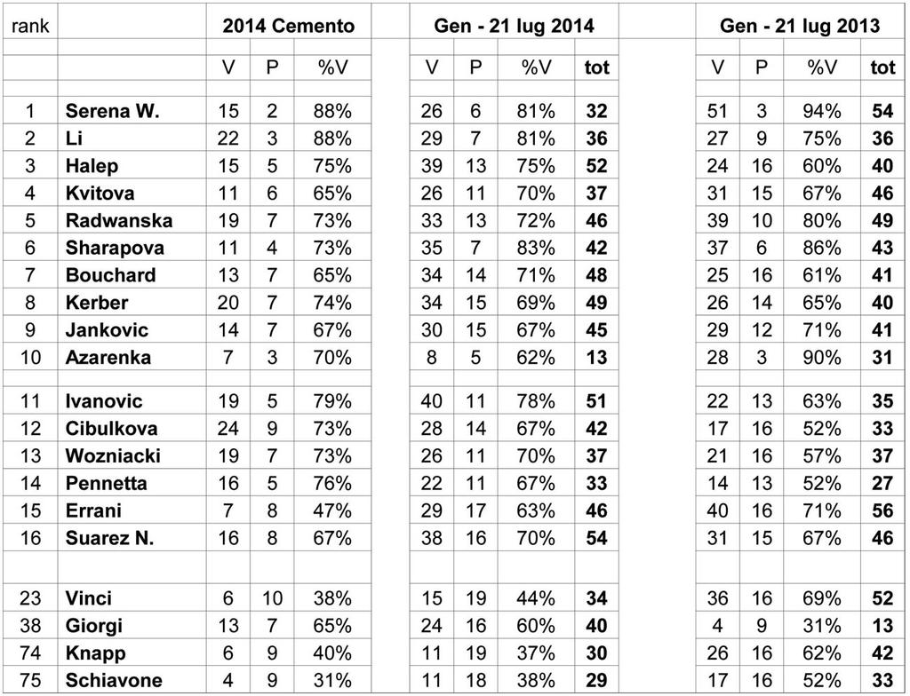 Nella tabella colpisce il calo generalizzato di Serena rispetto al 2013: meno partite, meno vittorie e più sconfitte; anche se alla fine sul duro ha perso solo due volte (da Ivanovic a Melbourne e da Cornet a Dubai).