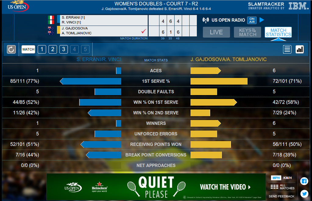 Nel parziale decisivo, le due italiane servono molto bene, 76%, ma raccolgono troppo poco: le statistiche riportano infatti un misero 45% di punti vinta con la prima, addirittura il 22% con la seconda. Facile intuire allora che piega abbia preso la partita, terminata nuovamente 6-4 per la coppia australiana.
