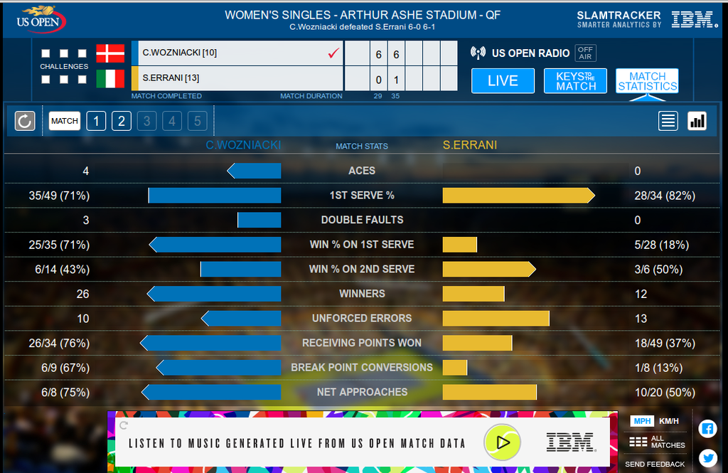 La Wozniacki non ha solo vinto 6-0 6-1 ma ha anche fatto più del doppio di punti di Sara, 57 contro 26.