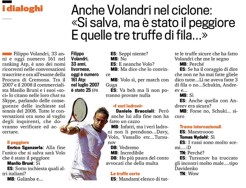 La Gazzetta dello Sport di oggi, oltre a pubblicare un altro stralcio delle intercettazioni in mano alla Procura di Cremona, dedica un altro pezzo (con apertura a doppia pagina con il titolone “Una Top 10 di indagati”) proprio alla facilità con la quale si può condizionare il risultato di una partita di tennis.