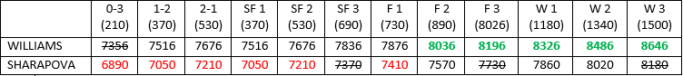 - se Serena chiude il RR con un bilancio di 1V, 2P, Sharapova deve raggiungere almeno la finale vincendo i due singolari di RR