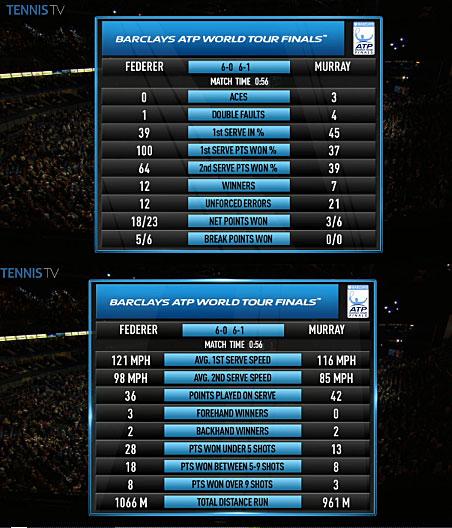Poi, dall’altra parte, si trovava Roger Federer. Chiaramente, le Finali di Londra ispirano lo svizzero – alla sua 71esima vittoria quest’anno – che aveva rifilato un 6-3 6-0 a Nadal nel 2011 e un 6-1 6-4 a Djokovic nel 2010. E, con lo stesso Murray, aveva vinto nei tre precedenti qui a Londra. L’eccitazione dei media inglesi era forte – la BBC si è spinta a dire che Murray aveva una più alta chance di vincere con Federer, di quanta ne avesse con Nishikori… – ma, d’altra parte, Murray era in vantaggio nei precedenti con lo svizzero sino a quest’anno, quando le sconfitte a Cincinnati e agli Australian Open avevano livellato il punteggio. Prima del match, Federer aveva dichiarato che Murray era di nuovo in fiducia, e aveva ritrovato consapevolezza del suo gioco. La determinazione con cui lo svizzero ha corso su ogni palla, e non mollato un singolo punto, però, hanno demolito le forse ritrovate certezze dello scozzese. Tra il secondo ed il quinto game del primo set Federer ha realizzato quattordici punti consecutivi. In tutto il match, lo scozzese non è riuscito a realizzare più di un trenta nei turni al servizio dello svizzero che, quando si è presentato a rete, è stato quasi letale (18/23).