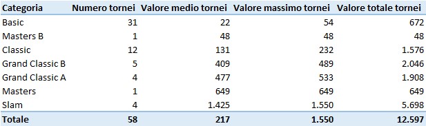 Migliori 5 tornei della stagione senza considerare il coefficiente di categoria (ovviamente il valore reale del torneo non è quello visualizzato nell’elenco sottostante, ma quest’ultimo moltiplicato per il coefficiente di categoria del torneo)