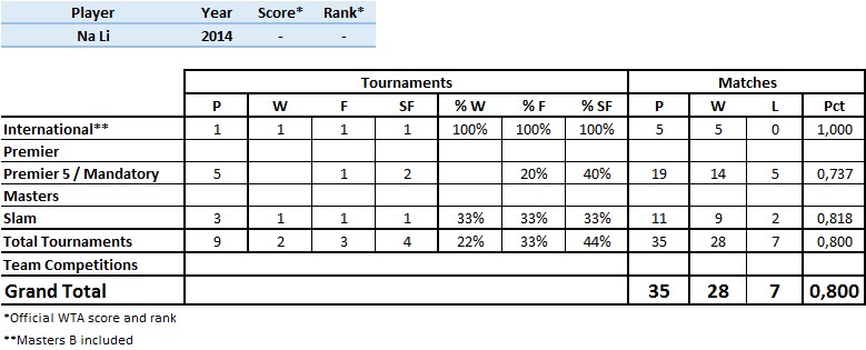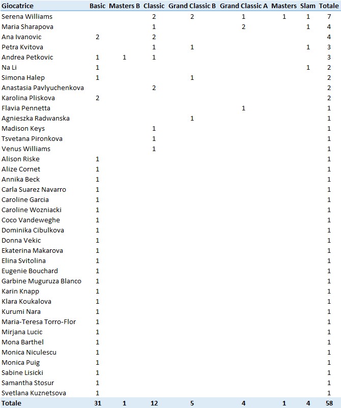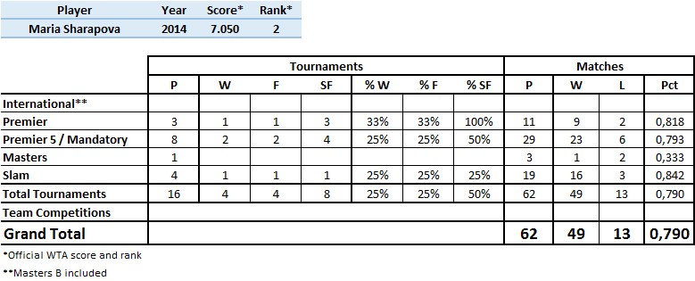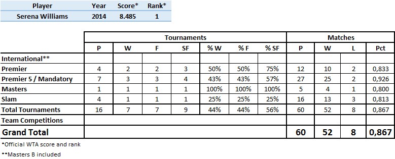 Il nostro modello di analisi del tennis, che nel corso del 2014 ha subito una modifica rilevante, della quale daremo di seguito conto, assegna anche l’annata 2014 a Serena Williams, anche se, rispetto al 2013, sia il valore assoluto della prestazione della giocatrice americana, sia il delta sulla seconda classificata, sono in netto calo. Difficile dire se si sia di fronte al canto del cigno oppure a una stagione non troppo consistente da parte di Serena: i due matches contro Simona Halep in occasione delle WTA Finals sono l’epitome di questo dubbio. D’altronde, anche in passato Serena Williams ha alternato stagioni straordinarie a stagioni sotto tono, ed è impossibile ricavare serie indicazioni sul futuro da questo 2014. Nel complesso Serena ha vinto 7 tornei (1 Slam, il Masters, 1 Premier Mandatory, 2 Premier 5 e 2 Premier) su 16 presenze in un main draw, senza perdere alcuna finale, ma compiendo molti passi falsi: basti dire che non è arrivata nemmeno al quarto di finale in tre dei quattro slam giocati. La pct stagionale, derivante da un record di 52-8, è pari a 0,867. Al secondo posto troviamo Maria Sharapova, capace di conseguire 4 titoli (1 Slam, 2 Premier Mandatory e 1 Premier) in altrettante finali, anche lei a fronte di 16 presenze in un main draw. Al terzo posto si classifica Petra Kvitova, con 3 successi (1 Slam, 1 Premier 5 e 1 Premier) oltre a una finale persa (Premier Mandatory), a fronte di 19 presenze in un main draw. Da menzionare, per la Kvitova, anche la vittoria in Fed Cup (la terza vittoria della squadra ceca nelle ultime quattro edizioni). Simona Halep, che alla fine dello scorso anno segnalavamo come da tenere d’occhio per il 2014, si è classificata ottima quarta con 2 titoli (fra i quali il primo Premier 5 della carriera) e 3 finali perse, tutte molto rilevanti dal punto di vista qualitativo (1 Slam, la finale del Masters e 1 Premier Mandatory).