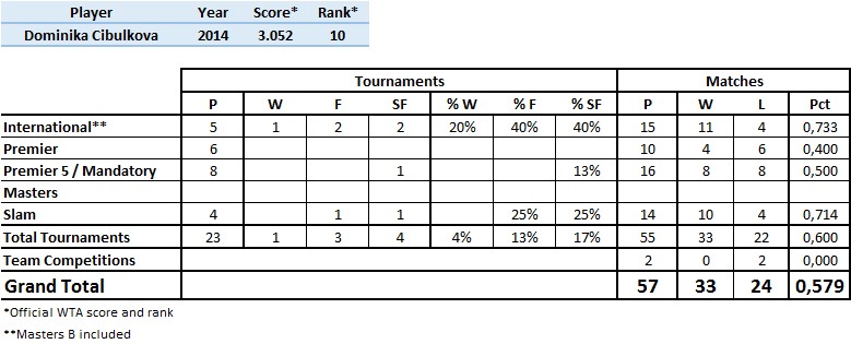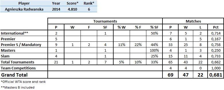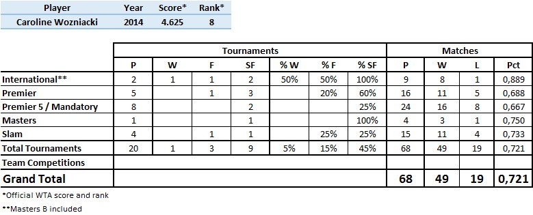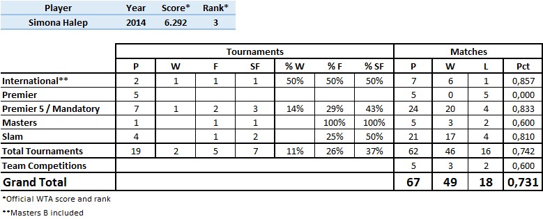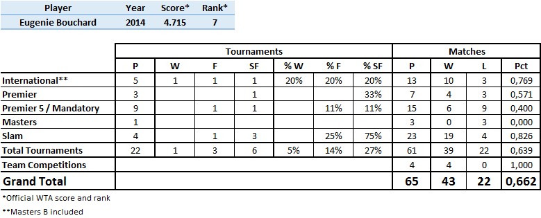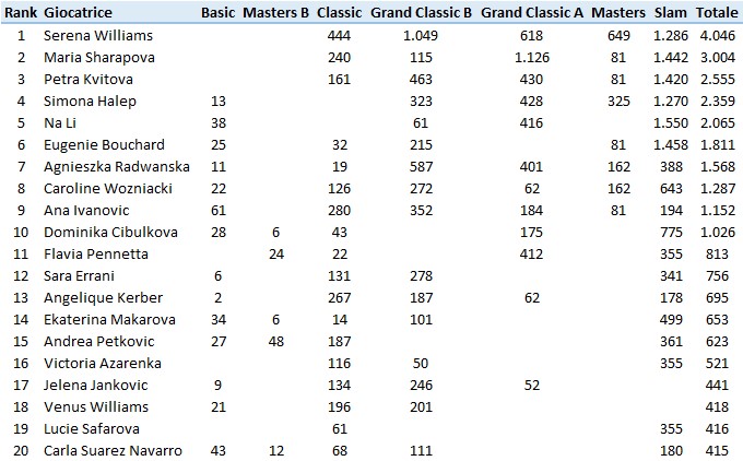 Sharapova, Kvitova, la neo-ritirata Li e Agnieszka Radwanska si confermano nella nostra top ten rispetto allo scorso anno, mentre escono dalle top ten Azarenka, Errani, Jankovic, la ritirata Bartoli e Kerber, per lasciar spazio a Halep, Bouchard, Wozniacki, Ivanovic e Cibulkova. Arrivata nel 2014 la conferma del valore della Halep, la principale attesa di novità per il 2015 riguarda la canadese Eugenie Bouchard, passata, nel nostro ranking, dalla posizione 36 del 2013 alla posizione 6 del 2014, con un’annata bizzarra (pct 0,826 negli Slam e 0,571 in tutti gli altri tornei, Fed Cup inclusa).
