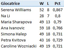W-L (giocatrici con percentuale di vittorie >=0,700 e almeno 28 partite giocate; inclusa Fed Cup)