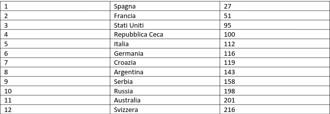 La classifica per nazioni somma il ranking dei primi tre giocatori di ogni Paese. Conduce la Spagna con Rafael Nadal (3), David Ferrer (10) e Feliciano Lopez (14). Al secondo posto si piazza la Francia con Jo-Wilfried Tsonga (12), Gael Monfils (19) e Gilles Simon (20). La Serbia di Novak Djokovic e la Svizzera di Roger Federer si collocano rispettivamente alla nona e alla dodicesima posizione.