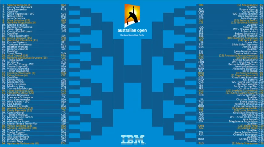 Poteva andare meglio a Serena Williams, che a Melbourne esce agli ottavi da tre anni e troverà delle giocatrici decisamente ostiche nel suo cammino verso la finale, che manca dal 2010. Il primo turno contro la belga Van Uytvanck non fa paura, come pure – ci duole dirlo – l’eventuale secondo turno con Vera Zvonareva, che dovrà battere una qualificata per tornare a sfidare Serena. Al terzo turno la prima testa di serie, cioè Elina Svitolina: poteva andare peggio. Ma dagli ottavi in poi c’è di che preoccuparsi: c’è Garbiñe Muguruza, per esempio, oppure Jelena Jankovic. La spagnola e la serba, prima degli ottavi, dovranno principalmente guardarsi dall’esperienza di Hantuchova e della meravigliosa quarantaquattrenne Date-Krumm. Ai quarti ci dovrebbe essere Caroline Wozniacki, che è certamente in forma e la favorita naturale della sua sezione di tabellone. La testa di serie numero otto è un avversario molto tosto, considerati i precedenti, anche se sembra soffrire di una sorta di complesso di inferiorità verso l’amica-rivale. Occhio ad Azarenka: è finita nel quarto di Wozniacki e affronta Sloane Stephens già al primo turno. La vincente troverà la danese, che al primo turno attende Taylor Townsend. Parecchio sfortunata Wozniacki, ma paradossalmente il tabellone diventa più semplice nel terzo turno (Zahlalova Strycova) e agli ottavi (c’è la finalista Cibulkova ma rischia di saltare già con Flipkens o Pironkova).