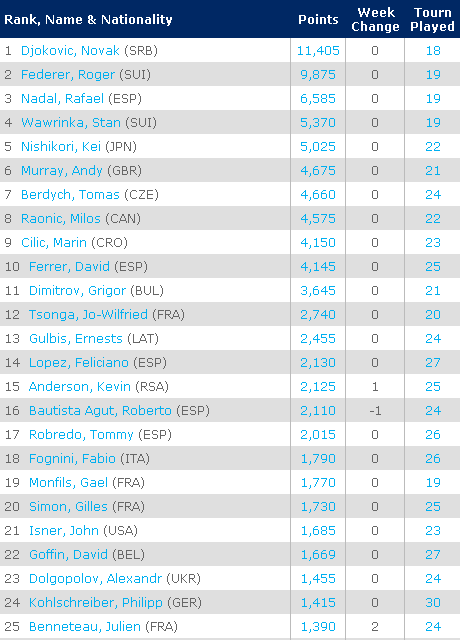 In attesa di poter rispondere a queste domande concentriamoci su ciò che è accaduto questa settimana. I due tornei in programma pre-Australian Open hanno visto il trionfo di Viktor Troicki (a Sidney) e del ventunenne ceco Jiri Vesely (ad Auckland). I due hanno battuto in finale rispettivamente Mikhail Kukushkin e Adrian Mannarino. Grazie alla vittoria a Sidney Troicki guadagna trentotto posizioni e sale al numero 54 del ranking. Balzo in avanti anche del francese Mannarino che, nonostante la sconfitta in finale ad Auckland, raggiunge il suo best ranking passando dalla 44° alla 36° posizione. Best Ranking anche per Jiri Vesely (numero 39) e Kevin Anderson che, grazie alla semifinale raggiunta in Nuova Zelanda, guadagna una posizione e si colloca al numero 15. Salgono di due posizioni Julien Benneteau (25) e Leonardo Mayer (26), scendono di due Ivo Karlovic (27) e Richard Gasquet (28). Bernard Tomic, eliminato nei quarti di finale di Sidney da Gilles Muller, passa dalla 71° alla 66° posizione, mentre il finalista di Sidney Mikhail Kukushkin dalla numero 66 alla numero 51.