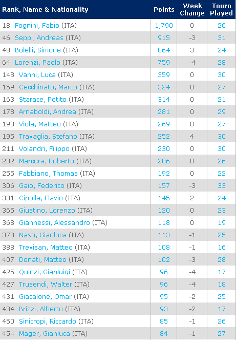 Sono quattro i tennisti italiani nella top 100. Guadagna tre posizioni Simone Bolelli, eliminato da Troicki nei quarti di finale del torneo di Sidney, ne perde tre Andreas Seppi. Scende di quattro posizioni anche Paolo Lorenzi. Stabile invece Fabio Fognini, primo italiano in classifica e numero 18 del mondo.