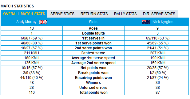 L’aggressività del teenager australiano Nick Kyrgios nulla ha potuto contro la solidità del britannico Andy Murray (ricordiamoci che è scozzese solo quando perde) che parte determinato, approfitta delle opportunità e qualche regalo di troppo da parte di Kyrgios e si dimostra semplicamente troppo forte per il giovane australiano.