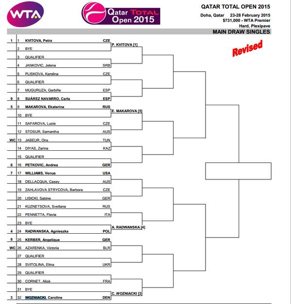 Halep era la testa di serie numero due ma al suo posto non entrarà una lucky loser. Il suo posto nel tabellone verrà preso da Caroline Wozniacki, numero tre del draw e a questo punto Carla Suarez Navarro guadagna un posto tra le testa di serie, lei che era la prima esclusa. Ekaterina Makarova diventa inoltre la testa di serie numero 4 (sul tabellone è la numero 5, ma è tra le prime quattro di fatto) e quindi usufruisce di un bye.