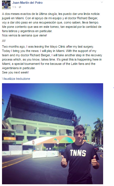 “Due mesi fà stavo lasciando la Mayo Clinic dopo il mio ultimo intervento chirurgico. Oggi voglio darvi una news: giocherò a Miami. Con il supporto del mio team e del mio dottore Richard Berger, farò un altro passo nel processo di recupero, che come sapete richiede tempo. E’ una grande cosa che stia accedendo qui a Miami, un torneo speciale per me, per la presenza in particolare dei tifosi latini ed argentini. Ci vediamo la settimana prossima”