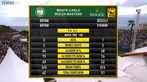 Nella finale del doppio del Masters 1000 di Montecarlo Fabio Fognini e Simone Bolelli si arrendono in due set ai numero 1 del mondo, 7-6 6-1. Masters 1000 numero 34, secondo in stagione, e quinto titolo a Montecarlo, secondo di fila, a distanza da 8 anni dal primo nel 2007