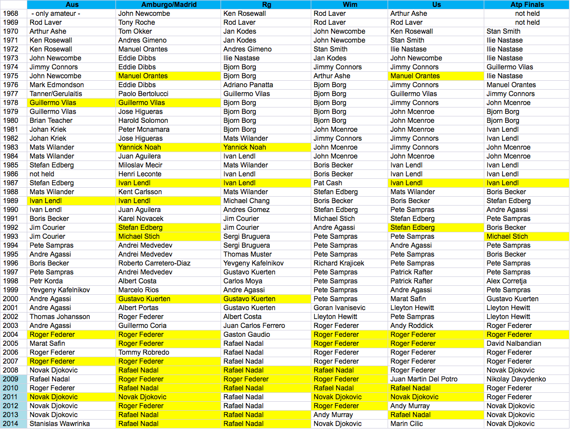 I dati più significativi però si evincono dalla media punti (prima colonna a partire da destra), ottenuta in questo modo: per ogni giocatore si divide il numero punti conquistati per il numero di edizioni disputate, ottenendo una cifra che è tanto più elevata quante più volte il soggetto ha raggiunto le fasi finali del torneo. Notiamo che in testa alla classifica svetta “Gattone” Mecir, con la media di 5,33. Mecir ha partecipato solo 3 volte (sempre ad Amburgo), ottenendo una vittoria e due sconfitte in finale. In seconda piazza si trova Nadal (4,88), seguito da Federer (4,46). Curiosità: il n.1 al mondo Djokovic ha una media punti bassa, pari a 2, avendo vinto solo una volta (Madrid) su sette edizioni giocate.