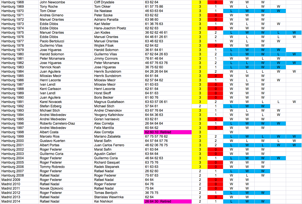 Dal 1968 – primo anno Open – hanno avuto luogo 47 finali nel cosiddetto “3rd clay Master”, ossia il terzo appuntamento sul rosso più importante, con Monte-Carlo e Roma, prima del Roland Garros: fino al 2008 la sede è stata Amburgo, dal 2009 Madrid (con l’anomalia del 2012, giocato sempre nella capitale spagnola ma sulla terra blu con il torneo tedesco retrocesso ad ATP 500).