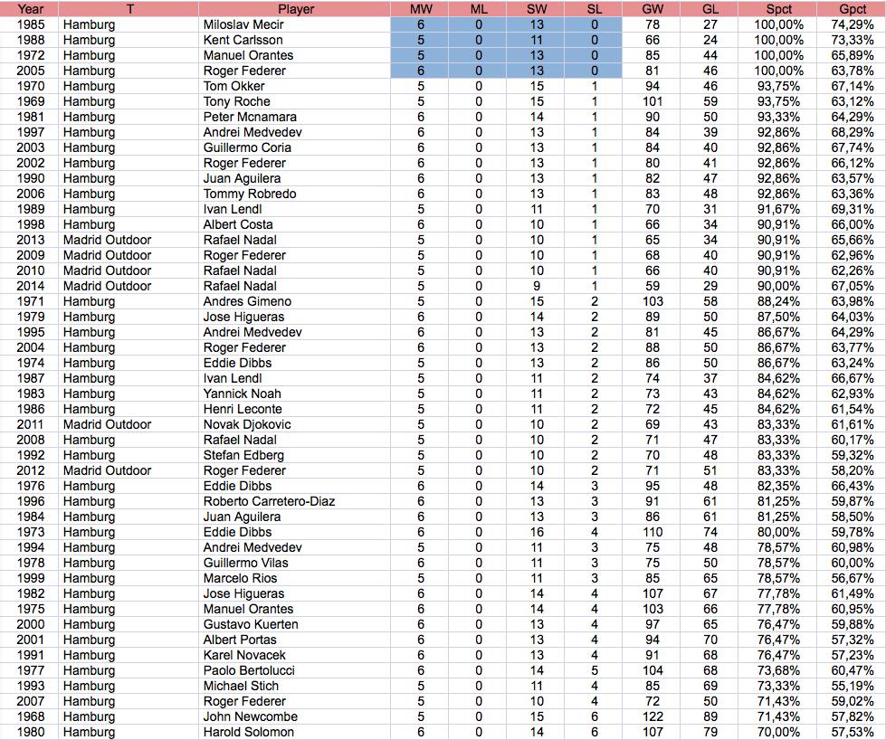 In quattro occasioni il vincitore di Amburgo non ha perso neppure un set in tutto il torneo: ci riferiamo a Mecir, Carlsson, Orantes e Federer. A Madrid tale impresa non è mai riuscita a nessun tennista. Mecir primeggia in quanto a percentuale di games vinti, con il 74,29% ottenuto nell’edizione del 1985 (Amburgo), seguito da Carlsson con il 73,33% (Amburgo – 1988) e da Lendl, con il 69,31% (Amburgo – 1989).