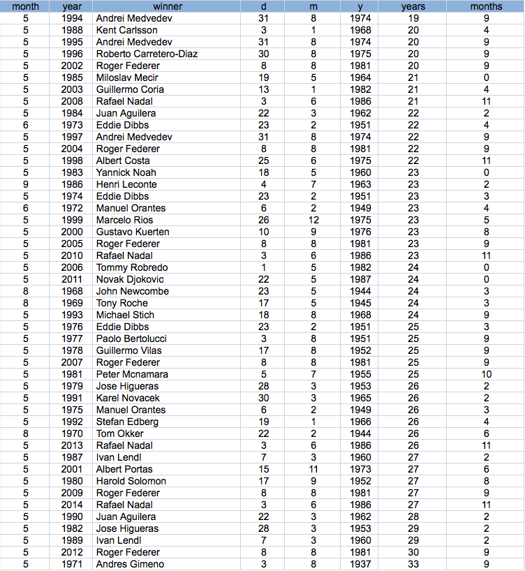 E’ Andrei Medvedev il giocatore più giovane ad essersi aggiudicato il torneo in esame; l’unico a farlo prima di compiere i vent’anni. Da notare il fatto che Nadal – tennista che si è aggiudiacto il primo Roland Garros a soli 19 anni – ha dovuto aspettare quasi i 22 per imporsi. Il torneo ha costituito invece uno dei primi successi importanti per Federer che ha alzato la coppa nel 2002. Lo stesso Roger è contemporaneamente il secondo più anziano vincitore: nel 2012 sulla terra blu. In assoluto il record spetta a Gimeno vincitore ad Amburgo nel 1971.