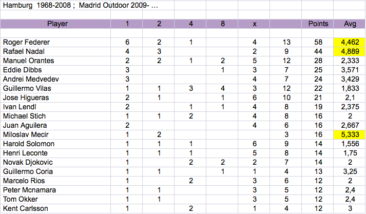 In termini assoluti (valori riportati nella seconda colonna a partire da destra) e cioè sommando i punteggi assegnati come detto in precedenza, vediamo primeggiare Federer, il quale totalizza ben 58 punti, essendosi aggiudicato il torneo ben 6 volte (4 Amburgo e 2 Madrid). E’ seguito da Nadal, a quota 44 (1 Amburgo e 3 Madrid) e poi, a notevole distanza, da Orantes (28 punti), Dibbs (25 punti) e Medvedev (24 punti). Su 13 partecipazioni, Federer è giunto in finale in 8 occasioni; Nadal ha giocato 7 finali su 9 tornei disputati. Singolare il dato di Medvedev: ha trionfato 3 volte (Amburgo) e nelle restanti 4 partecipazioni non ha neppure raggiunto i quarti di finale.