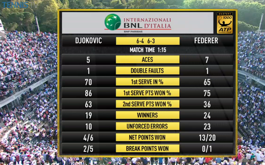 [1] N. Djokovic b. [2] R. Federer 6-4 6-3 (da Roma, Claudio Giuliani)