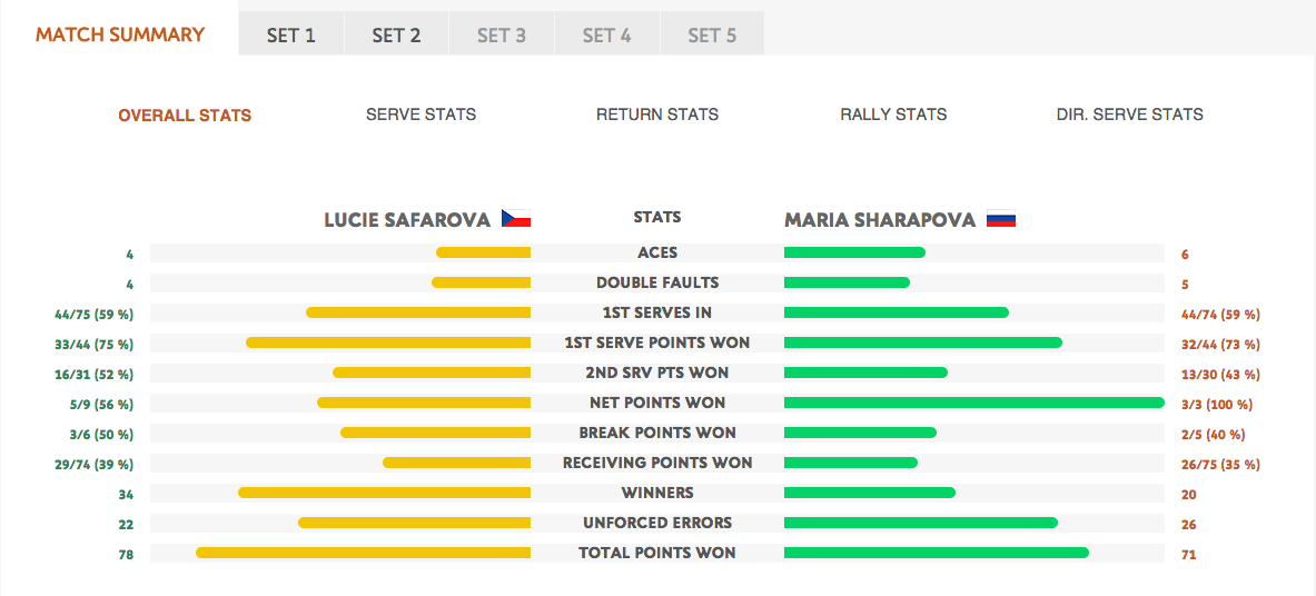 Da sottolineare la sportività della Sharapova che sul 30-15 del gioco successivo, dà buona una palla chiamata fuori e senza che l’avversaria avesse chiesto una verifica. Soffre sul 5 pari ma infila una serie di dropshot, lob, vincente di dritto e ace per garantirsi almeno il tiebreak. Poi porta dal 40-15 ai vantaggi la ceca ma non riesce ad ottenere setpoint e, al jeu décisif, si fa aggredire dal primo punto. Masha, destabilizzata dall’ottimo tennis dell’avversaria, commette pure un doppio fallo e scivola 6-1. Dopo 1 ora e 1 minuto manda fuori il dritto e consegna a Lucie il primo set, con solo 3 punti vinti.