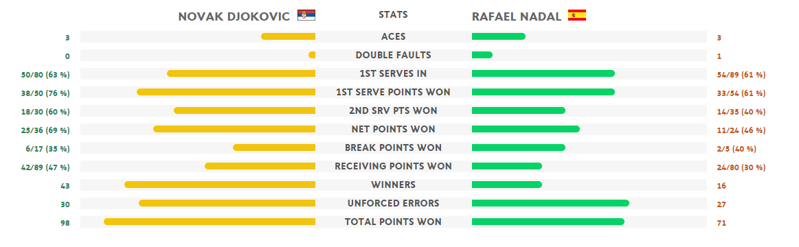 È vero che Nadal non è mai domo? Eccone l’ennesima prova, con una rimonta dallo 0-4 al 4-4, quando l’avversario sembrava non lasciargli respiro. Il serbo sale ancora 5-4 e, dopo scambi al fulmicotone, ha a disposizione un setpoint, che lo spagnolo annulla magistralmente con una smorzata maliziosissima. Ma ce n’è un altro. Annullato ancora. E, alla fine, è Nadal ad aver ragione del game, pareggiando i conti sul 5-5. La partita si annuncia interminabile e, sul 6-5 Novak, questi ha un 4° setpoint, tuttavia prontamente annullato con uno smash a 3/4 di campo che, per giunta, sfiora il nastro. Ne arriva un quinto. Il setpoint per il serbo non s’ha da fare: Rafa mette a segno un servizio vincente. Novak non molla e ne ha a disposizione un 6°. È quello buono, grazie ad una volèe in corsa di Rafa messa in corridoio. Il n. 1 del mondo fa suo il primo parziale per 7-5 in 1 ora e 7 minuti. Sul proprio servizio Nadal ha conquistato 22 punti perdendone altrettanti.