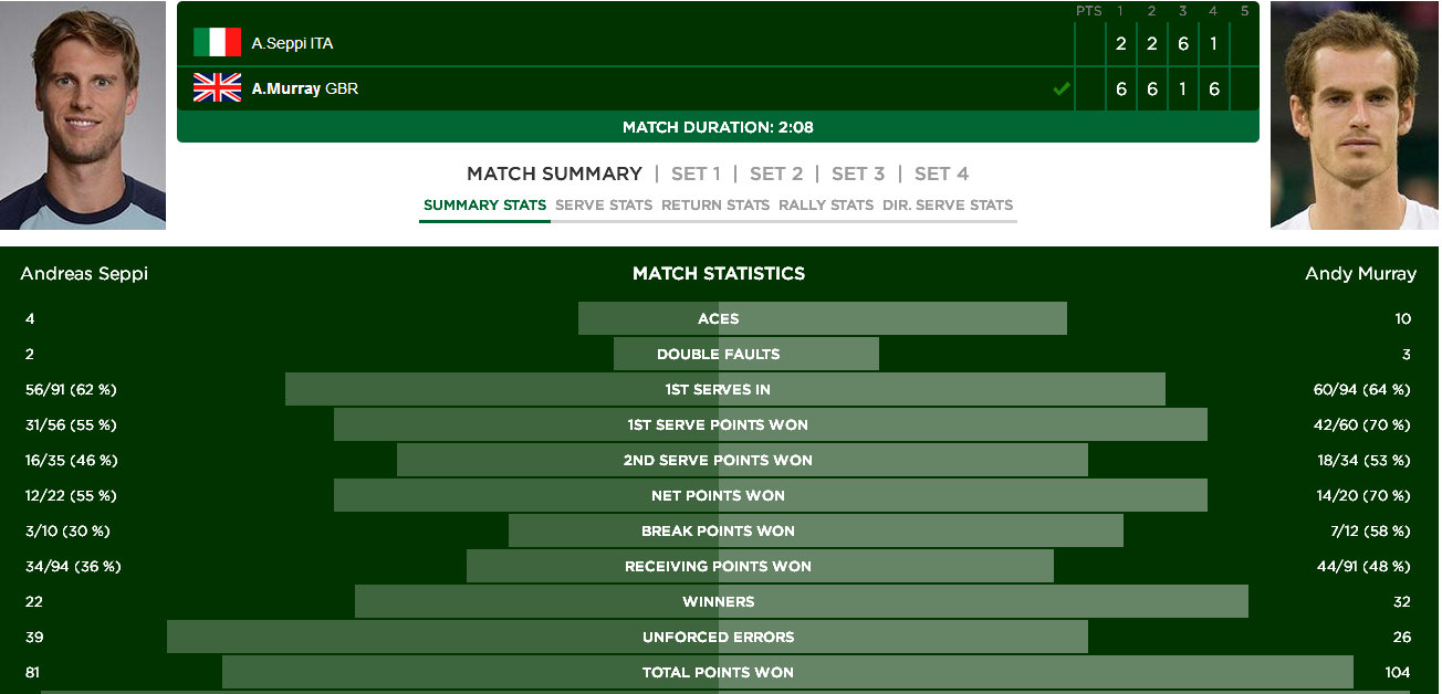 Dopo la sconfitta di Camila Giorgi era chiedere davvero troppo ad Andreas Seppi di salvare l’onore italico contro un giocatore che in una forma fisica straripante e che pare – meglio andarci cauti – avere raggiunto anche un equilibrio mentale mai visto prima. Del resto, per Andrew Murray, cominciano a parlare i risultati. Quando vinse qui due anni fa aveva saltato Parigi, quest’anno ha disputato invece una splendida stagione sul rosso, ha rivinto il Queens, come nel 2013, e ha disputato tre turni impeccabili. Non che improvvisamente lo scozzese sia diventato un cannibale, e il passaggio a vuoto tra il terzo set, smarrito in mezzora, e il quarto è li a dimostrarlo, ma comunica una sicurezza che scevra da tensioni che due anni fa non sembrava avere. Seppi ha fatto quello che Murray gli ha permesso di fare. Travolto da un treno nei primi due set, bravissimo ad approfittare del momento di pausa di Andy, spaventandolo probabilmente anche fino al punto da indurlo a prendersi un po’ di tempo.