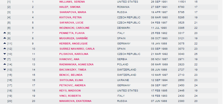 Flavia Pennetta, che fu nel 2009 la prima tricolore a rompere il muro delle top10,  è ovviamente l’azzurra meglio classificata al momento, davanti alla sua conterranea e finalista a New York Roberta Vinci (n.19) e Sara Errani (n.21), che restano stabili; la Errani ha come best ranking il numero 5 colto nel 2013 dopo la finale al Roland Garros, e siede dietro la Schiavone (ex numero 4 in seguito al successo a Parigi del 2010, oggi fuori dalle prime 100) nella classifica delle italiane meglio piazzate di sempre. Karin Knapp guadagna tre posizioni (42), nessuna novitĂ per la Giorgi (36).