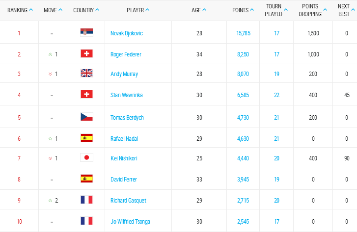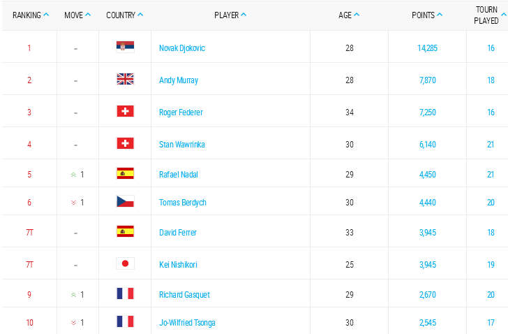 1) il maggior numero di punti ricavati dai tornei del Grande Slam, ATP World Tour Masters 1000 mandatory e Barclays ATP World Tour Finals;