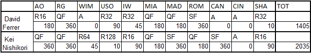 * Il risultato di Montecarlo, disputato soltanto da Ferrer e comunque ininfluente, non viene considerato perché non è un Master 1000 obbligatorio (ed infatti nel ranking è considerato in sostituzione di un ATP 500).