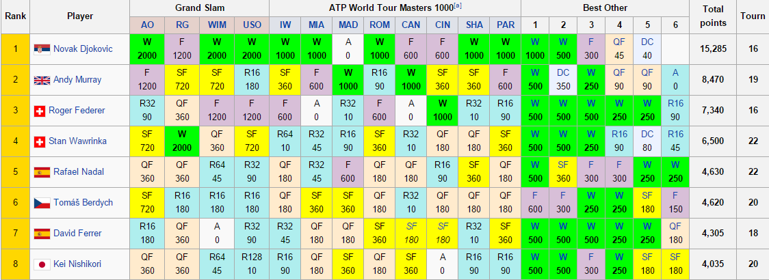 Questo le prime posizioni del Ranking (che questa settimana, è bene ricordarlo, si sovrappone perfettamente alla Race) e i punti raccolti dagli 8 qualificati alle ATP World Tour Finals