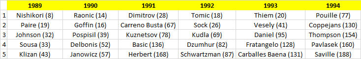 Inutile dire che scorrendo i nomi, è difficile pensare che in futuro questa generazione possa togliersi grosse soddisfazioni. Se da un lato abbiamo alcuni ottimi giocatori, che hanno già giocato finali Slam (Nishikori) o a livello di MS1000 (Raonic, Janowicz), o sono stati top10 (Dimitrov), molti invece sono degli habitué del circuito Challenger, che posso avere l’ingresso fra i primi 50 come obiettivo massimo. Addirittura disastrosa l’annata 1991, dove al momento il solo Dimitrov è stato in grado di vincere un torneo ATP (e in generale ad oggi il più giovane in attività ad esserci riuscito è Dominic Thiem, nato il 03/09/1993). Nel 2015 giocatori come Johnson, Paire, Goffin, Tomic, Sock e Thiem hanno vissuto la loro stagione migliore, ma a parte forse gli ultimi due, gli altri difficilmente potranno diventare dei giocatori capaci di stare stabilmente nei top10.