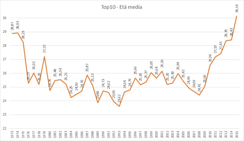 E qui possiamo vedere l’andamento dell’età media dei top10 a fine anno dal 1973 ad oggi: