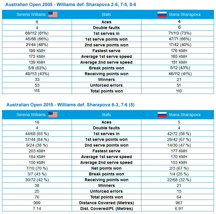 Nel 2005 il rendimento delle due giocatrici sulla prima di servizio nell’arco del match era stato assolutamente identico (66% di punti vinti), tanto che la differenza era stata determinata dai punti vinti sulla seconda. Nel match del 2015 è invece la qualità della prima di servizio a scavare il solco determinante: 18 ace in due soli set, e 84% di punti vinti con la prima per Williams, contro il 67% di Sharapova, che pure a distanza di dieci anni ha leggermente migliorato con la seconda di servizio (47% contro 40%).