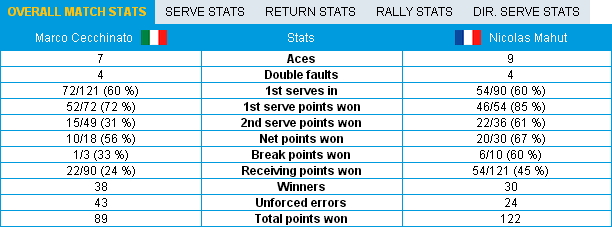 Tecnicamente se la stanno giocando entrambi abbastanza bene, buon tennis pulito e gradevole stilisticamente da un lato e dall’altro, più aggressivo Mahut, più manovriero da fondo Cecchinato. Ma l’esperienza a questi livelli è tutta in favore di Nicolas, che comincia a servire sempre meglio, e dopo aver salvato un 30-40 nel primo game del terzo set, non rischia più nulla sulla sua battuta. E sul 3-2 in suo favore strappa il servizio a Marco per la terza volta, va 4-2 e poi 5-2 in un attimo, per poi chiudere ancora al primo set point: ancora 6-2, a livello di gioco non c’è tutta questa differenza, ma i punti pesanti li sta facendo praticamente tutti Mahut. Marco spinge, Nicolas usa molto lo slice e scende più spesso, è un match gradevole.