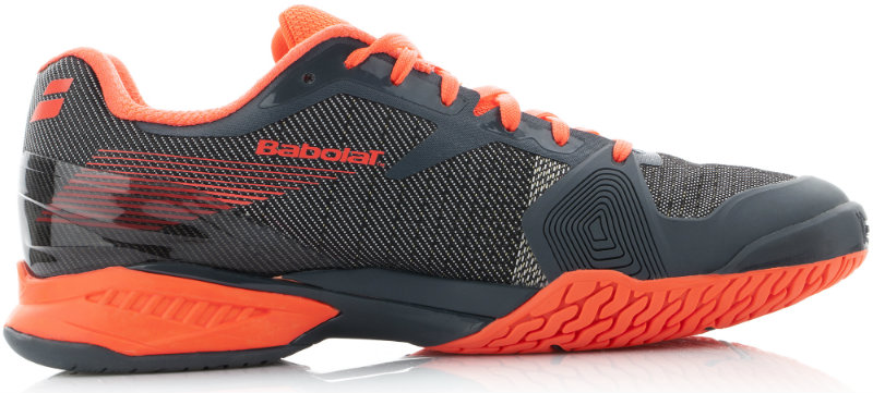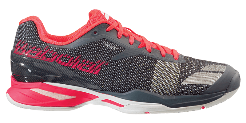Trecento grammi sembra essere l’orizzonte, la cifra che è diventata in pochi anni lo standard di peso nelle racchette e che ora promette di diventare anche quella del peso delle scarpe da tennis. Dei fili ultra resistenti in Kevlar intrecciati fra loro costuiscono la tomaia “Matrix”, un brevetto esclusivo di Babolat sviluppato in Francia e studiato specificatamente per il tennis di alto livello. Si tratta di un materiale robusto che offre sostegno al piede essendo molto leggero allo stesso tempo. In alcune zone queste trame sono più fitte, per favorire il sostegno, mentre in altre sono meno dense per avvantaggiare il fattore leggerezza. E poi la suola, che presenta con tecnologia unica sviluppata da Babolat e che ha battistrada by Michelin, con una gomma esclusiva che promette ottimi risultati in durabilità. Il look poi, molto aggressivo e che mette in evidenza le tecnologie usate. JET è disponibile nella bellissima e aggressiva versione nera e rossa (non a caso quella che Babolat usa per la promozione) ma anche in versione bianca con inserti blu e grigia con inserti gialli. Ovviamente, c’è anche il modello donna nelle stesse colorazioni.