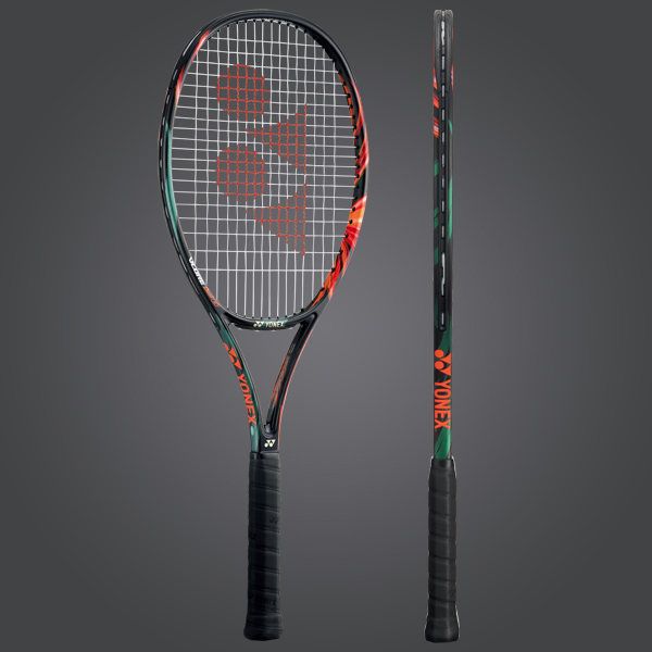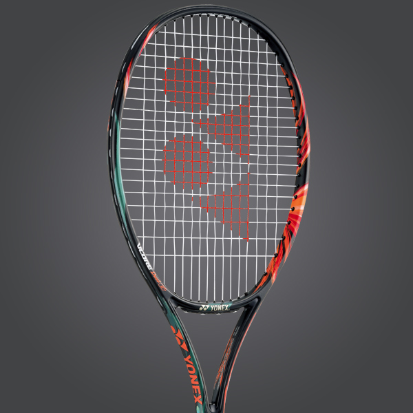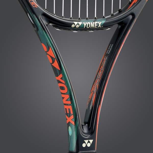 Yonex rinnova la sua linea di punta con l’introduzione della linea V Core Duel, che va a rimpiazzare la V Core Tour, i modelli arancioni resi famosi da Stan Wawrinka con il suo rovescio. Questo telaio promette di dare una risposta ai molti giocatori desiderosi di un attrezzo più “giocabile” ma con caratteristiche prossime al modello di punta della casa madre, quello preferito dagli agonisti. E allora ecco che la gamma Duel comprende, oltre al modello in oggetto, ampio 100 pollici e pesante 300 grammi, due versioni più pesanti, piatto 97 con peso 310 e 330 grammi, e i modelli Alfa, pesanti 270 e 290 grammi. Con queste scelte Yonex copre tutta la tipologia di giocatori: dai tennisti senior che vogliono il piatto grande e il peso ultra leggero agli agonisti avanzati, che vogliono racchette pesanti 330 grammi e oltre con le corde. Esteticamente la Duel piace molto, più del modello precedente (almeno questa è l’impressione dominante al circolo). L’arancio e il verde si mescolano al nero opaco, il colore dominante; ci sono gli intarsi colorati che oramai conosciamo e delle striature su uno dei lati: il risultato finale è molto aggressivo. La novità tecnica riguarda i tre fori condivisi sui lati del telaio, una scelta che si traduce in un movimento maggiore delle corde verticali e quindi una maggiore facilità di generare top spin. La racchetta ora è più rigida anche grazie a questa soluzione.
