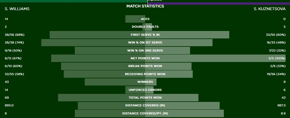 Il secondo set era un “one woman show”, con Serena capace non solo di picchiare ma anche di prodursi in raffinatissime demivolée. Era decisamente troppo per la povera Svetlana.
