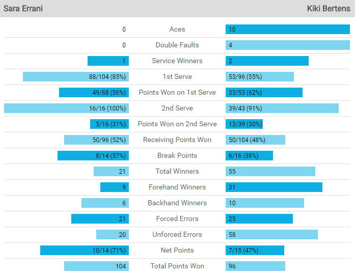 Qui però era molto abile Sara a cambiare qualcosa negli scambi, spostando bene il gioco dal diritto al rovescio della Bertens, portando inesorabilmente all’errore l’olandese, che concedeva di nuovo il break con il terzo doppio fallo del suo match, e successivamente non riusciva a convertire uno 0-30 concedendo quindi il secondo set all’italiana.
