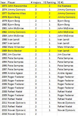 Nel frattempo Sir Murray conquista un altro titolo e si prospetta un ipotetico dato statistico interessante: qualora dovesse rimanere invariata la classifica mondiale, il tennista scozzese diventerebbe il primo giocatore, dal 1989, ad aver concluso la stagione da numero uno del mondo, avendo vinto un solo Slam durante l’anno. Infatti, come si può constatare nella tabella riportata di seguito, nessun giocatore, che ha vinto almeno due Slam, non ha chiuso  la stagione da numero 1. Questo dato è preso in considerazione a partire dal 1989, anno in cui Boris Becker vinse due titoli Slam (Wimbledon e US Open), ma alla fine della stagione il posto da numero uno toccò a Ivan Lendl, che vinse “solo” l’Australian Open in quell’anno. Questo primato potrebbe essere raggiunto da Andy Murray, dobbiamo solo aspettare le Finals.