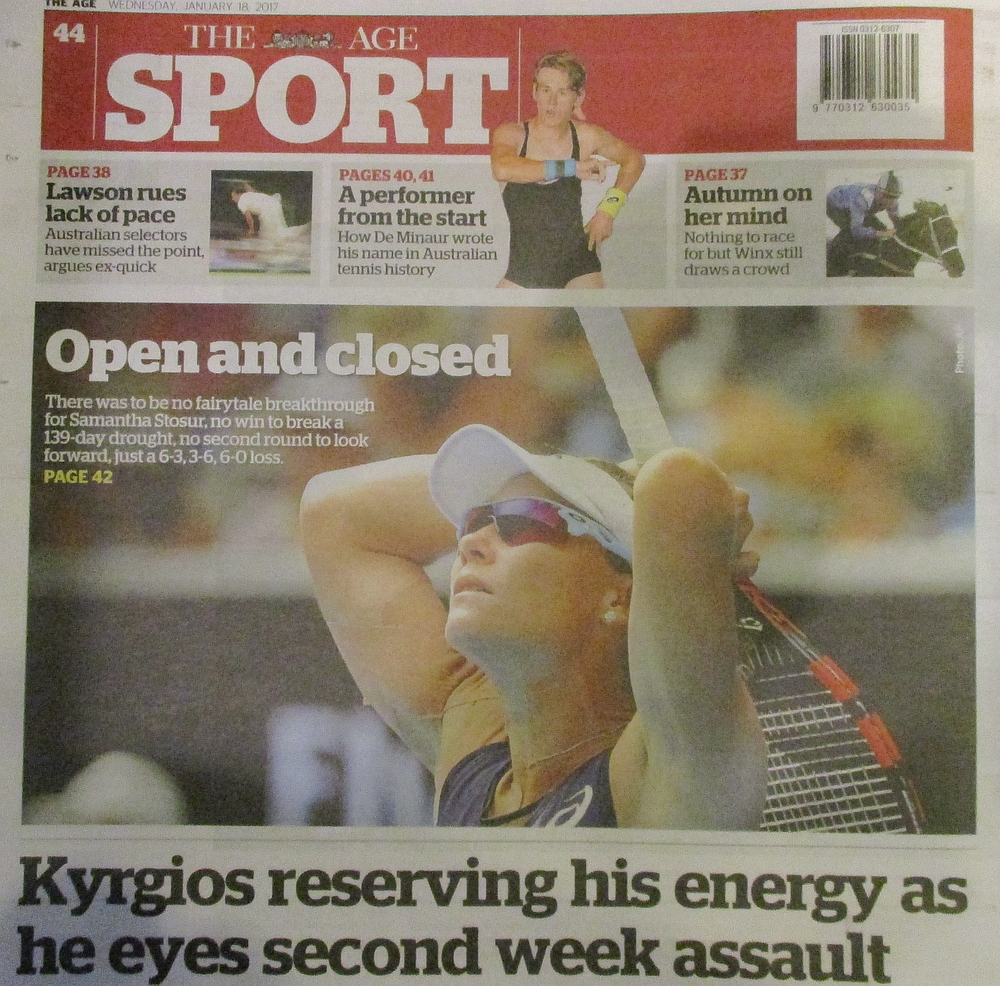 La prima di sport dello stesso “The Age”, oltre al richiamo al già visto esilarante spettacolo di Alex, titola a tutta pagina “Open and closed” (Aperto – con gioco di parole riferito al torneo – e chiuso), abstract “There was to be no fairytale breakthrough for Samantha Stosur, no win to break a 139-day drought, no second round to look forward, just a 6-3 3-6 6-0 loss” (Non era destino che ci fosse l’esplosione da favola, la vittoria che interrompesse un digiuno di 139 giorni, un secondo turno da aspettare, solo una sconfitta per 6-3 3-6 6-0). Sotto, un titolo su Nick Kyrgios, “Kyrgios reserving his energy as he eyes second week assault” (Kyrgios risparmia le energie con in vista l’assalto alla seconda settimana).