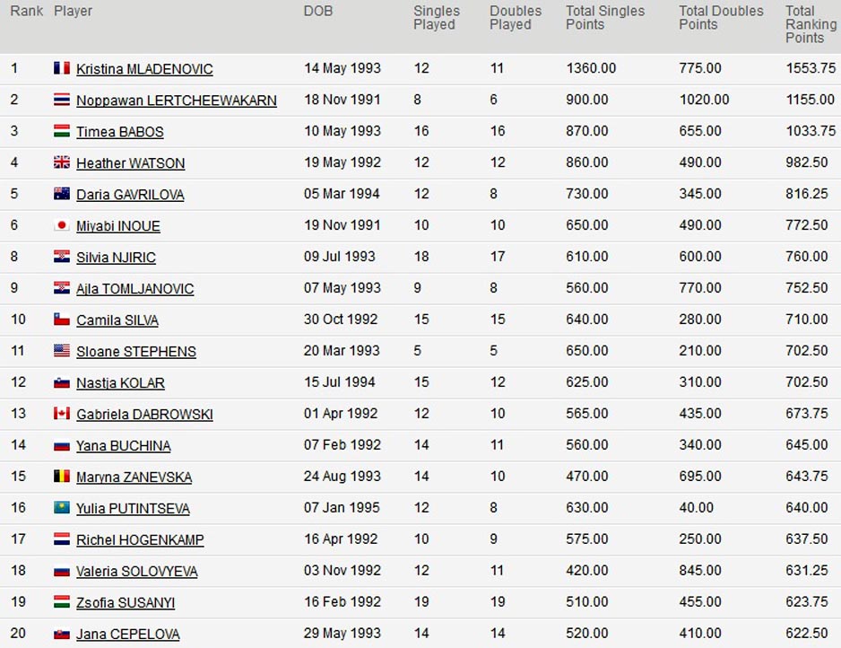 Kristina “Kiki” Mladenovic è stata una grande stella del tennis giovanile, con una carriera quasi da predestinata: raggiunge il numero uno del ranking junior nel 2009 a 16 anni appena compiuti (è nata il 14 maggio 1993) subito dopo aver vinto il Roland Garros in finale contro Daria Gavrilova. La vittoria apre un periodo straordinario, con l’affermazione a Roehampton e la finale a Wimbledon. Il successo all’Osaka Mayor’s Cup e la finale all’Orange Bowl tra ottobre e dicembre sanciscono il suo primato stagionale, davanti a nomi che sarebbero diventati importanti anche tra le professioniste come Babos, Watson, Gavrilova, Tomljanovic, Stephens, Putintseva, Cepelova. Questa era la classifica junior al termine del 2009:
