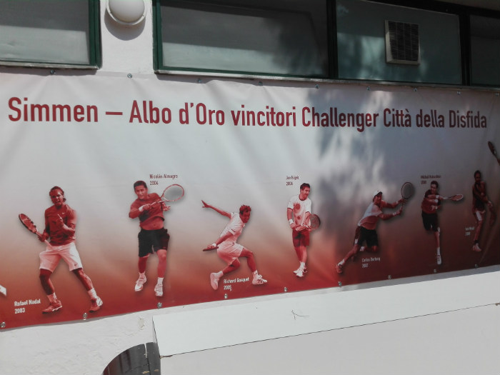 Sotto il caldo sole della cittadina pugliese – che il mare ce l’ha, per quanto a molti sfugga e le spiagge siano effettivamente bruttine – l’afflusso degli appassionati è parecchio timido in mattinata, mentre non è affatto timida la pubblicità dell’imminente sfida di Fed Cup tra Italia e Taiwan che lo stesso circolo di Barletta ospiterà tra dieci giorni. I campi in terra rossa sono cinque, ma uno è stato invaso dalle tribune che ora troneggiano al di sopra del campo centrale. Si gioca anche sul campo n.1, adiacente alle sale interne del circolo, come segnala l’order of play che stampato a guisa di quello dei grossi tornei sembra inorgoglire il personale che lo distribuisce quasi come figurasse il nome di Nadal tra i protagonisti. Beninteso, questo torneo Nadal una volta l’ha vinto davvero e i presenti nel 2003 non l’avranno dimenticato.