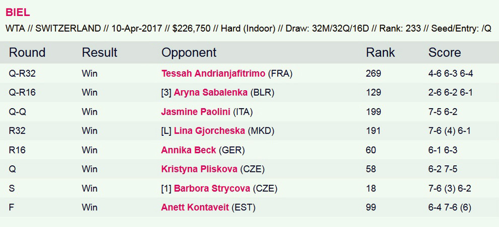 Ecco la sequenza di match di Vondrousova nel torneo di Biel. Come si vede ha perso il set iniziale nelle prime due partite di qualificazione, mentre ha poi vinto con un percorso netto nel main draw: